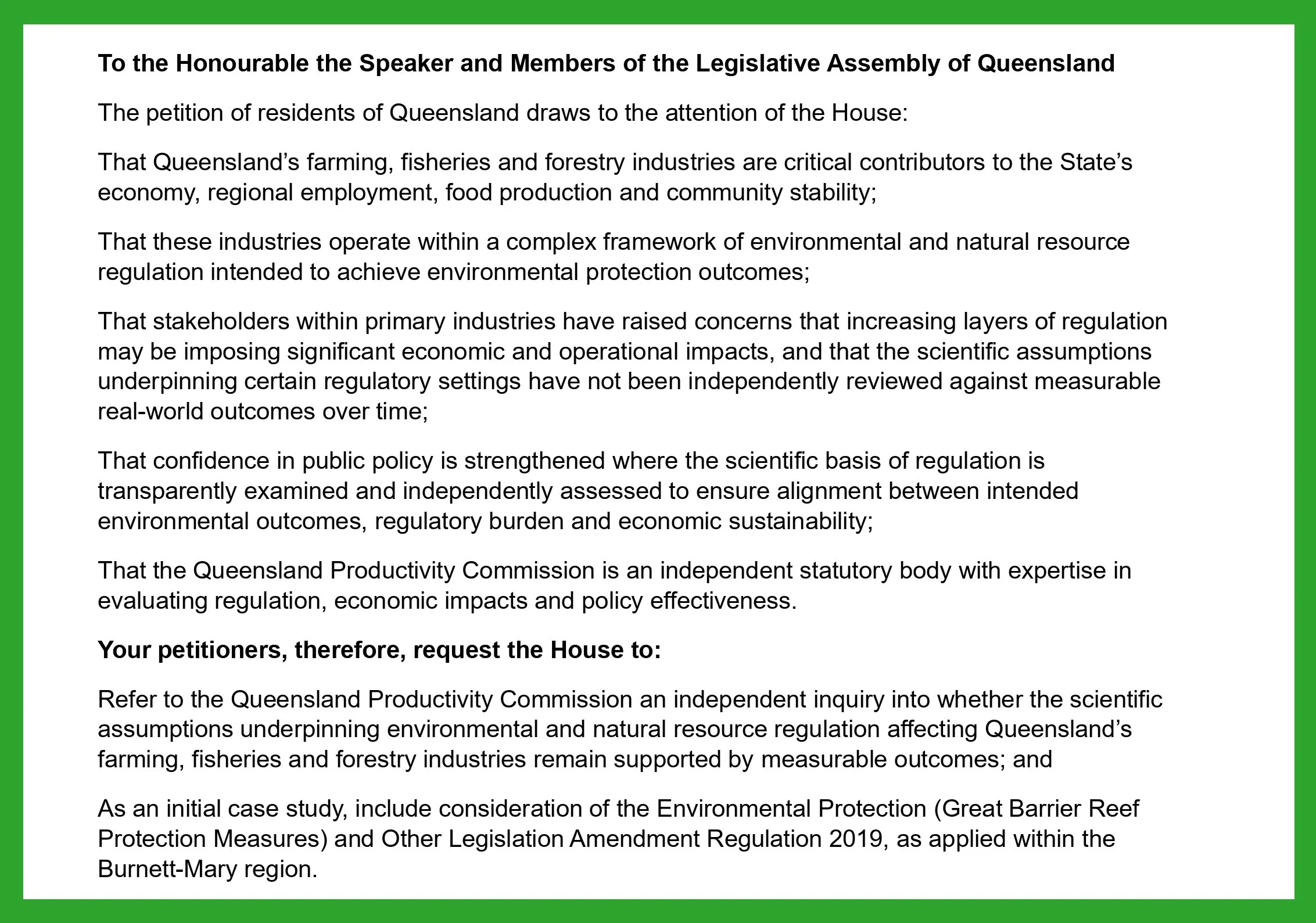 Premier David Crisafulli is being asked to refer the matter of checking the science behind State Government policy- and decision-making to the Queensland Productivity Commission (QPC). A Parliamentary Petition has been launched and signatures are being gathered.